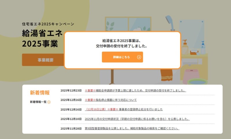 給湯省エネ2025事業は、補助金申請額の割合が予算上限に達したため、交付申請の受付を終了しました。2025年12月23日16時06分22秒に提出された申請を最後に予算上限額に到達しております。